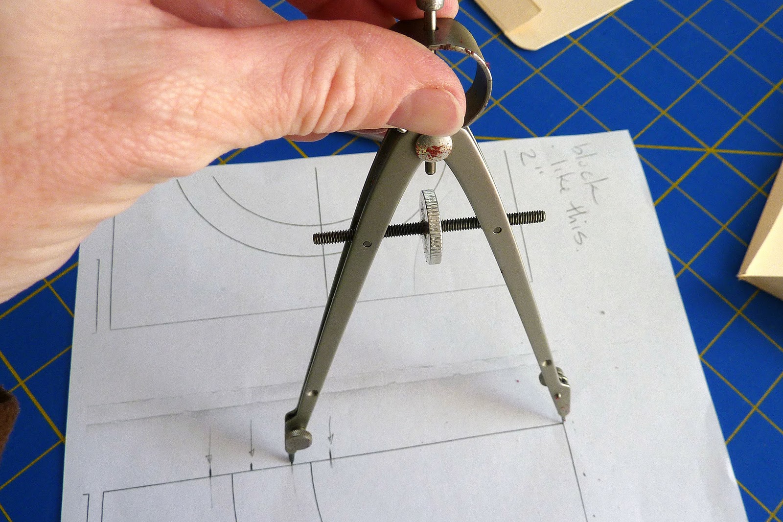 Put the paper on your cutting mat, then poke the pointy part through the corner of the block. Turn that little wheel in the middle until the pencil part of the compass lines up with the mark just outside of the inner wedge.