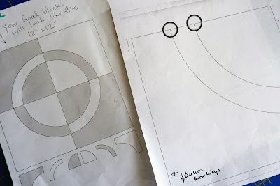 See how I stabbed it into the inside corner, not the outside one? If you're confused about that here's why: the pattern is a corner of the finished block. We want the circle to look like a round circle when we're done, and if you don't add the seam allowances or make your circle ON the edge of the seam allowance, when you sew them together you're losing a half inch of your shape on each edge. You'll end up with a rumply, non-round circle which I suppose you could FORCE into a flat circle, but I'm going with the nice, mathy geometry so that it works out the first time.
